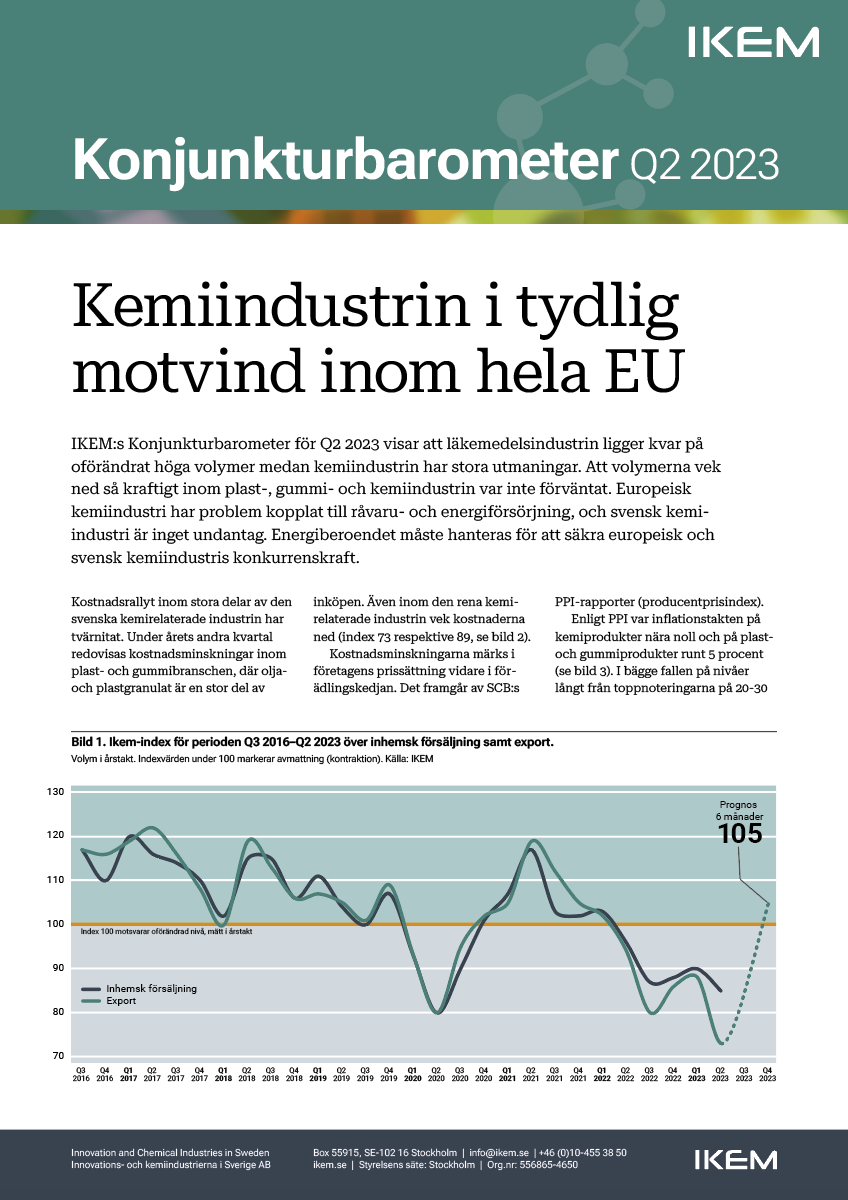 Q2 2023: Kemiindustrin i tydlig motvind inom hela EU IKEM, augusti 2023 Ladda ner IKEM:s Konjukturbarometer Q2 2023: Kemiindustrin i tydlig motvind inom hela EU PDF • 28 aug. 2023 Vår industri Fakta om våra branscher ✖ Innovationer för framtiden ✖ IKEM:s konjunkturbarometer Q1 2024 ✖ Q4 2023 sv ✖ Q3 2023 sv ✖ Q2 2023 sv ✖ Q1 2023 sv ✖ Q4 2022 sv ✖ Q3 2022 en ✖ Q2 2022 en ✖ Q1 2022 en ✖ Q1 2022 sv ✖ Q2 2022 sv ✖ Q3 2022 sv ✖ Prenumerera på Konjunkturbarometern ✖ Tidigare Konjunkturbarometrar ✖ ✖ Framtidens yrken söker nya talanger ✖